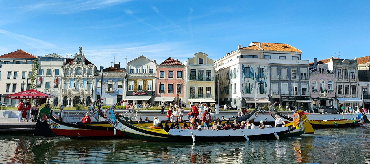 Parada en Costa Nova, paseo en barco moliceiro por Aveiro con degustación de dulces típicos, visita al centro histórico de Guimarães y llegada a Braga.